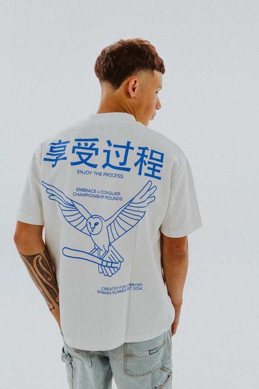 Experience ultimate comfort with our White Comfort Tee! Made of a cotton poly blend, this tee offers a slight crop fit for a trendy look. Its thick material provides lasting quality with royal blue printed logo accents on the back and front left chest.